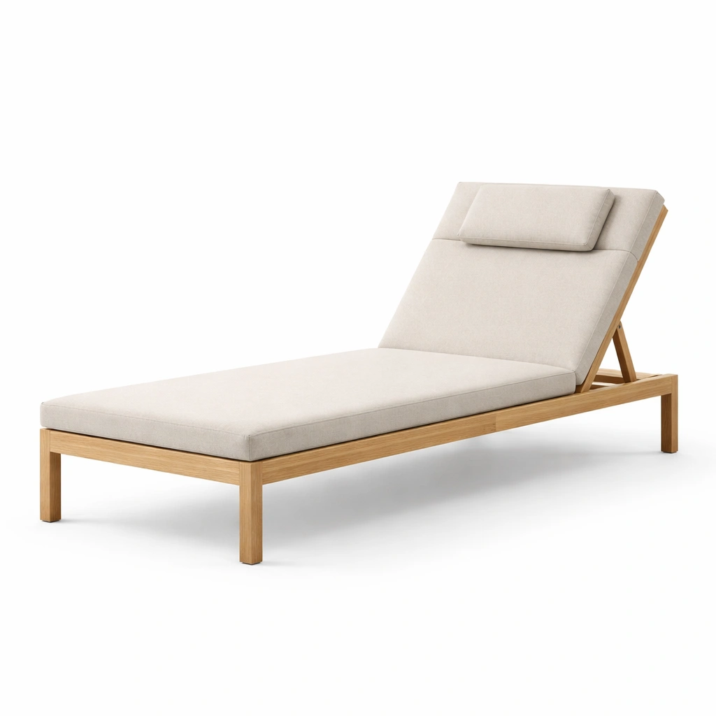 La estructura principal está hecha de madera de acacia. El cojín está relleno de espuma de poliuretano y tiene un forro de tela beige.